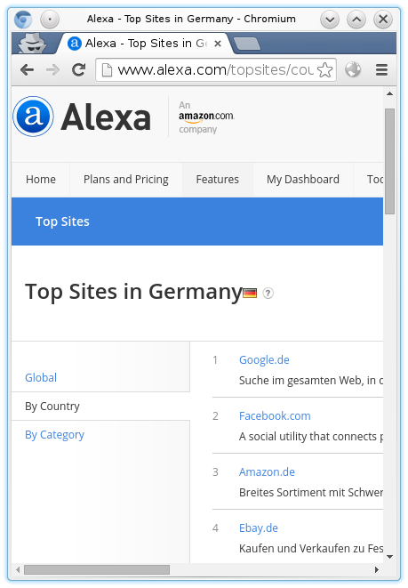 In, Germany, Google.de, a Google localization, tops the list of most popoular sites on Alexa.